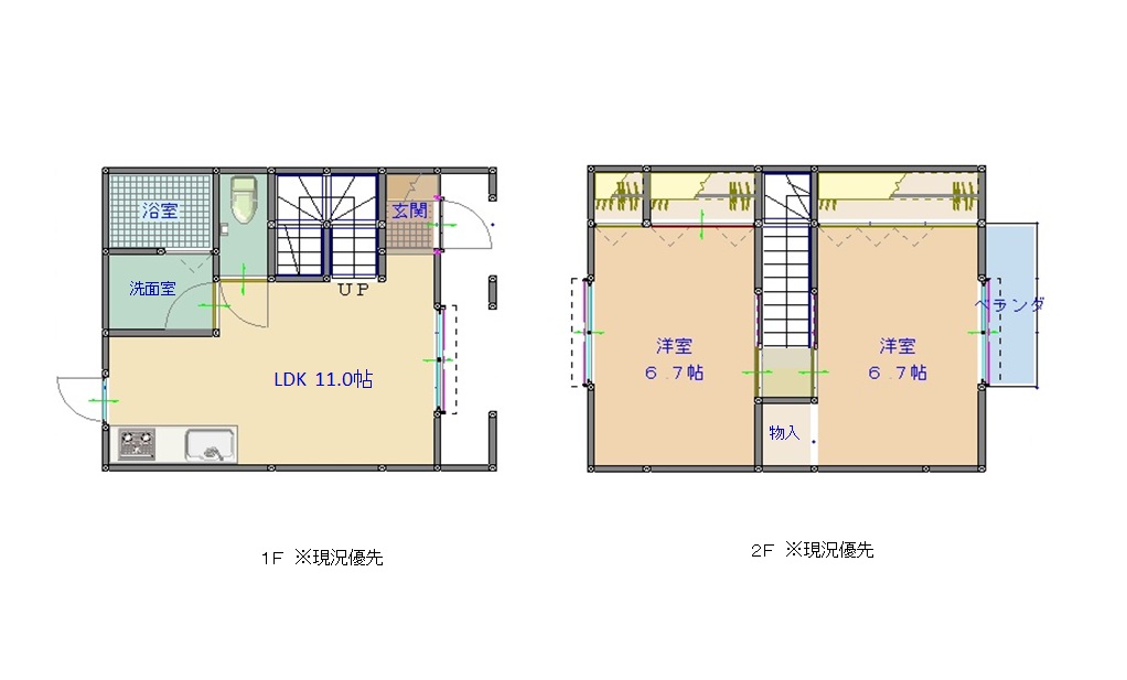 | 間取 | 洋室6.7帖×2 LDK11帖 洗面脱衣室 浴室 水洗トイレ クローゼット |